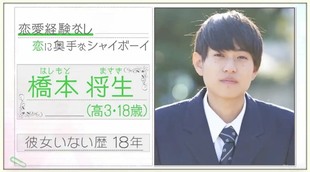 高校3年生の時期にあたる2018年2月〜3月、橋本将生さんはAbemaTVの恋愛リアリティショー「恋する♥週末ホームステイ」Season3に出演しています。